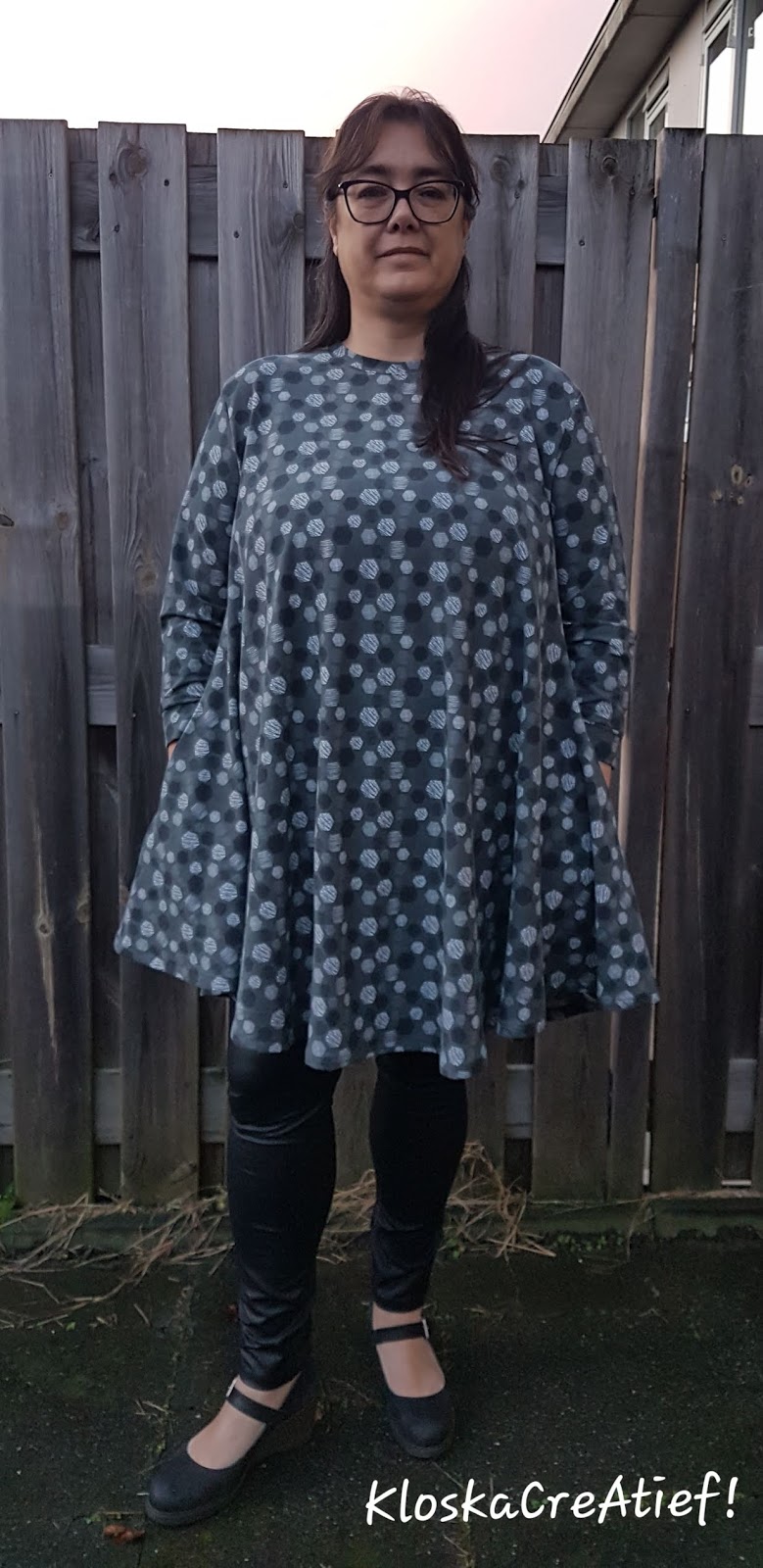 Het is wel een stofvreter, in mijn maat ben ik zo'n 3.5 meter stof kwijt. Ik kreeg 'm ook niet uit de gewone stofbreedte vanwege de wijd uitlopende onderkant. Ik heb de variant met 3/4 mouwen gemaakt en zakken.